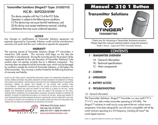 Linear DT Delta 3 Compatible - 310MHz Stinger Visor Remote 1-Button 8-Dip